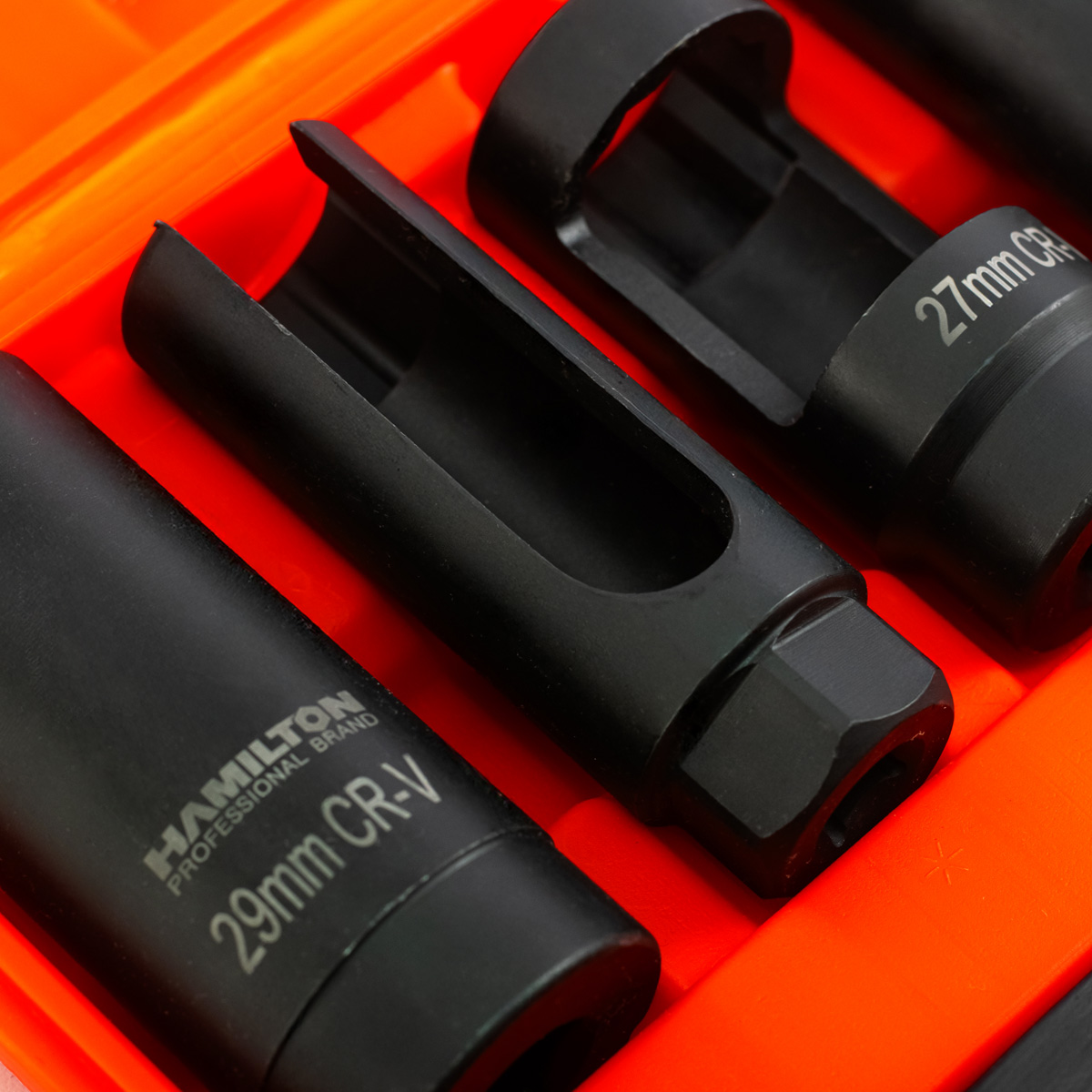 Un solo kit, múltiples aplicaciones para extraer una amplia variedad de sensores, bulbos, inyectores y sondas, adaptándose a distintos modelos y necesidades de trabajo. Las bocallaves del AUT216 están fabricadas en acero cromo-vanadio (Cr-V) reforzado con cromo y vanadio, elegido por su resistencia, protección contra la corrosión y capacidad de soportar torque elevado sin deformarse. La variedad de medidas, longitudes y encastres 3/8″ y 1/2″ te da más control en posiciones incómodas o de difícil alcance, mientras que el maletín plástico organiza y protege cada pieza para un traslado ordenado en el taller. Hamilton te da herramientas.