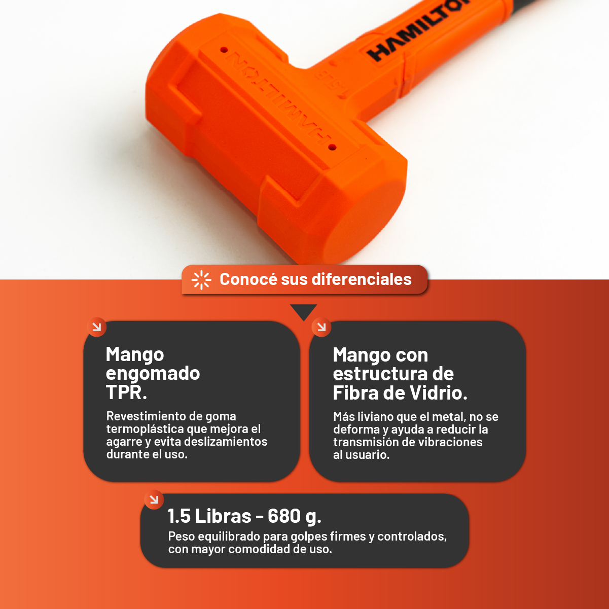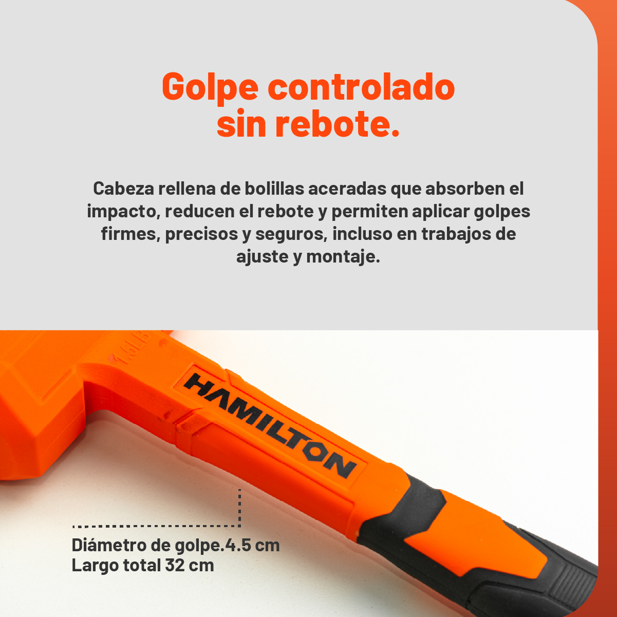 La maza antirrebote 1.5 libras Hamilton MAF015 está diseñada para golpear con control y precisión en tareas de ajuste donde el rebote de una maza convencional complica el trabajo. Su cabeza rellena de bolillas aceradas absorbe el impacto y estabiliza el golpe, logrando una transferencia de energía más efectiva y predecible, con un diámetro de golpe de 4,5 cm y un largo total de 32 cm para un manejo cómodo.