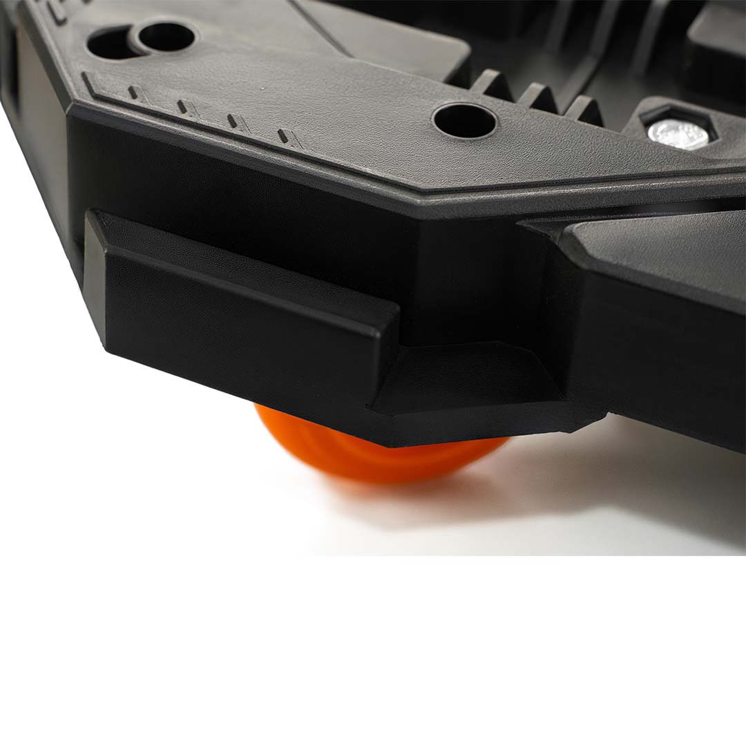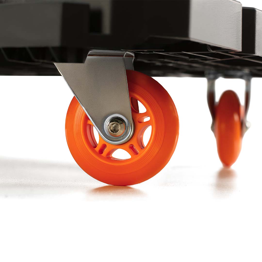 Fabricada en Polipropileno (PP) de alta resistencia, ofrece una durabilidad excepcional frente a la humedad y el desgaste, siendo significativamente más liviana y fácil de mantener que otras opciones. Su diseño de perfil bajo (12,5 cm) mejora el centro de gravedad, facilitando la carga de bultos pesados y reduciendo el esfuerzo físico del operario. Equipada con ruedas de PP + PU de 76 mm, asegura un rodamiento ultra-silencioso y fluido, ideal para suelos técnicos y salones de venta.
