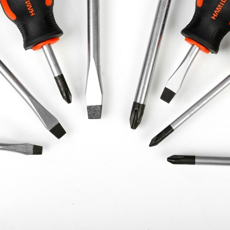 • 4 Destornilladores Planos: 5 x 75 mm. – 6 x 38 mm. (mango corto) – 6 x 100 mm. – 8 x 150 mm.