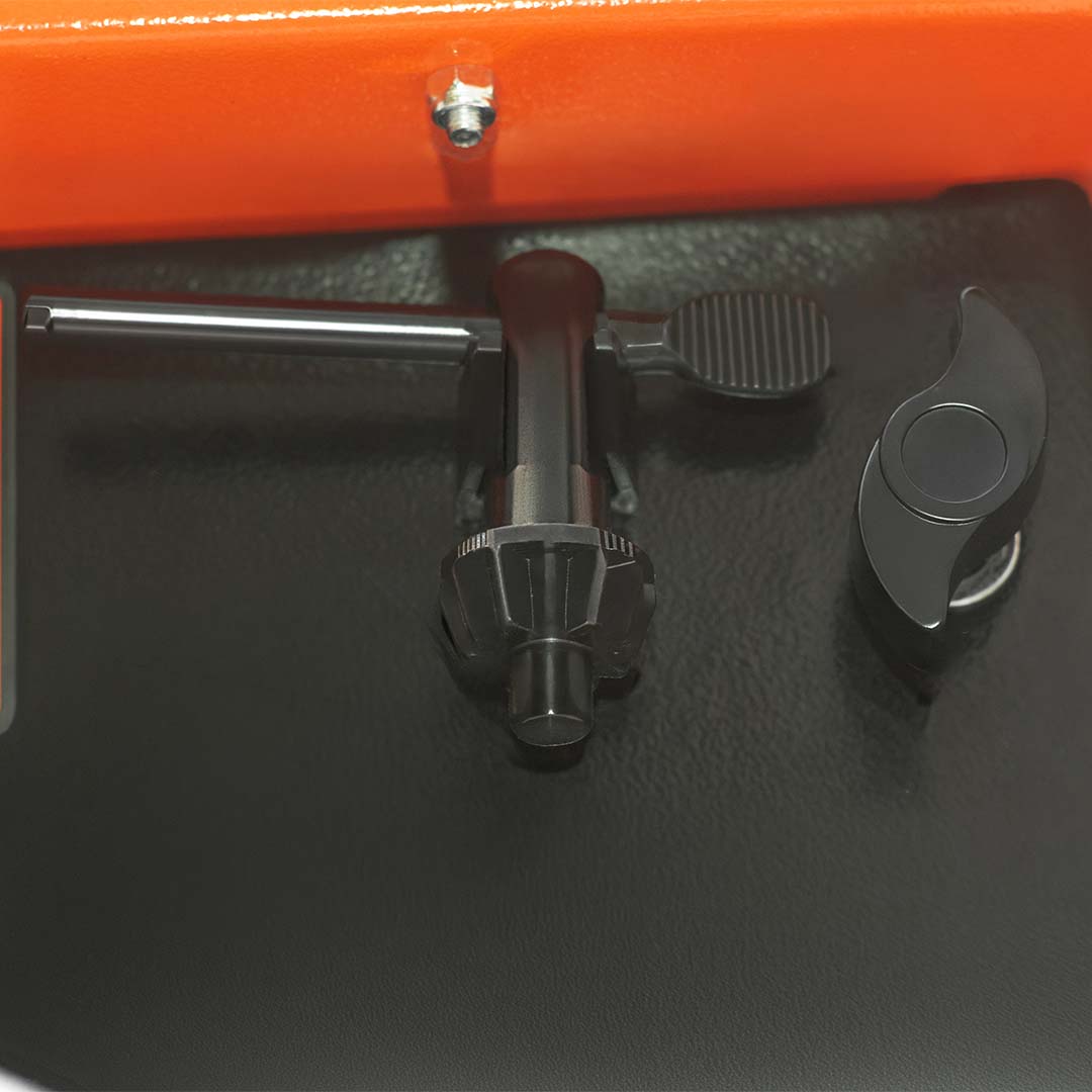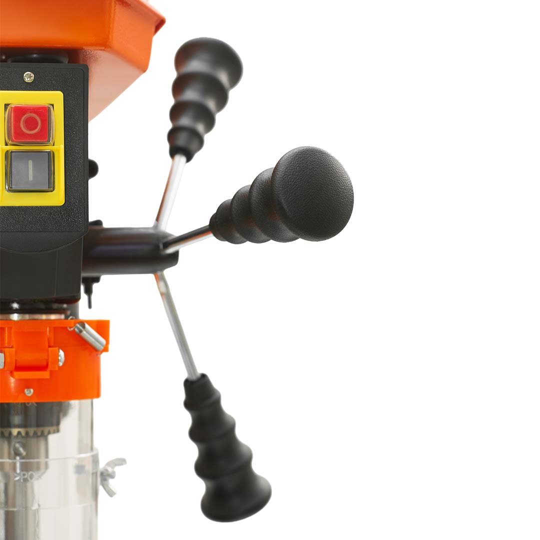 • Las manivelas de avance ergonómicas permiten aplicar presión sobre piezas de gran espesor con menor esfuerzo físico.
